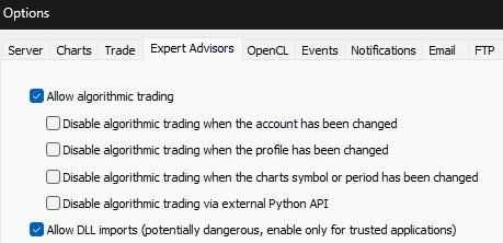 On the new pop-up, go to the "Expert Advisors Tab" and check the following options: